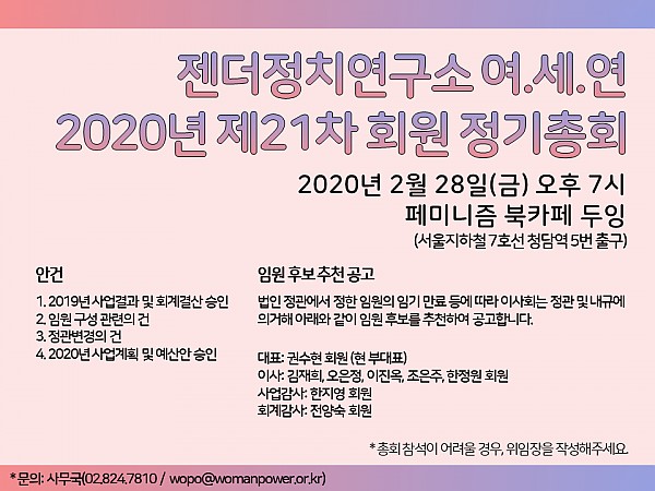 2월 28일(금), 2020년 제21차 회원정기총회가 개최됩니다.