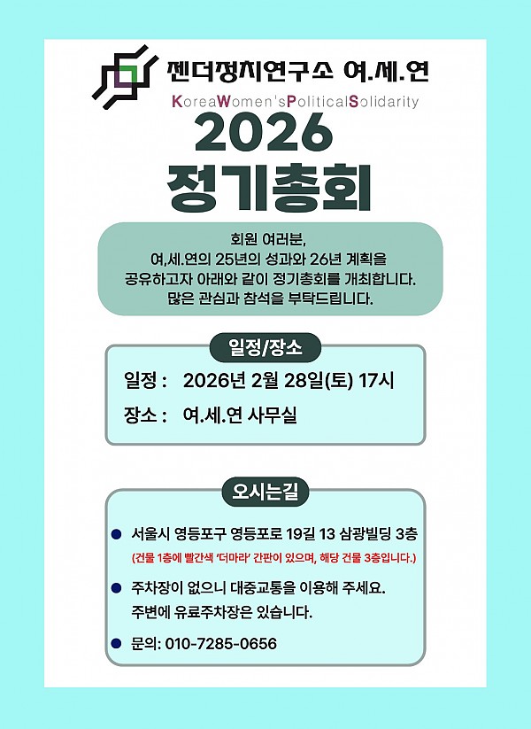 젠더정치연구소 여.세.연 제21차 회원정기총회가 연기되었습니다.